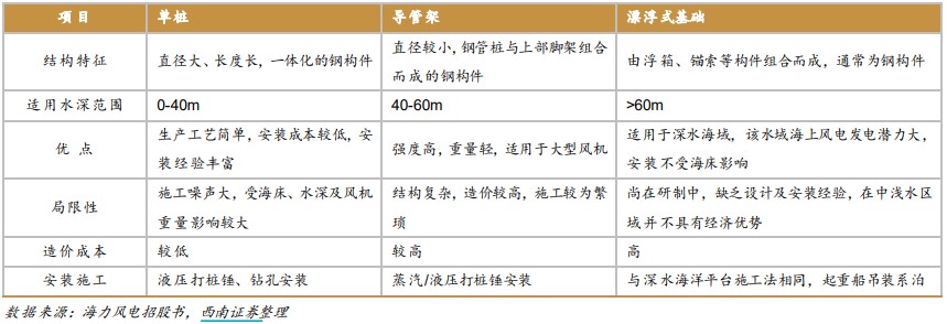 为应对不同水深,桩基的种类也有不同,由于目前我国多数的海上风电项目仍在0-40m,目前市场需求以单桩为主,少量深远海项目已应用导管架。